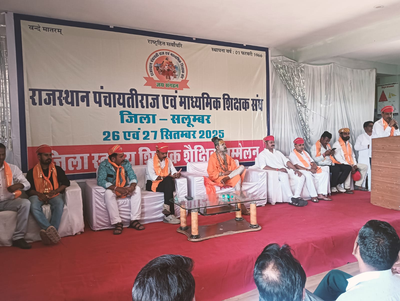 आयोजित हुआ। जिसमें कार्यक्रम की अध्यक्षता विधायक महोदया शांता देवी अमृत लाल मीणा, मुख्य अतिथि राव देवव्रत सिंह ठिकाना सलूंबर, विशिष्ट अतिथि तख़त सिंह शक्तावत पूर्व प्रधान गिर्वा,कैलाश गांधी,विजेश भलवाड़ा अध्यक्ष भाजपा शहर सलूंबर, संजय चाष्टा,सुरेन्द्र कुमार जैन निदेशक अनेकांत संस्थान, देवेंद्र सिंह शक्तावत ने कार्यक्रम की शोभा बढ़ाई। जिला अध्यक्ष स्वरूप सिंह शक्तावत ने बताया कि शिक्षक हित में संगठन हमेशा तत्पर रहता है। शिक्षकों की मुख्य मांगो में तृतीय श्रेणी अध्यापकों के स्थानांतरण ,पारदर्शी स्थानांतरण नीति बनाने, सभी संवर्गों की DPC करवाने, PD हेड के शिक्षकों का वेतन PEEO के माध्यम से करवाने,TET की अनिवार्यता पर पुनर्विचार याचिका दाखिल कर शिक्षकों को राहत प्रदान करने, पोषाहार सहित समस्त गैर शैक्षणिक कार्यों से राहत देने, शिक्षाकर्मी, पैराटीचर, एवं समस्त संविदा कर्मियों को नियमित करने, पंचायत शिक्षकों की सेवाएं नियमित की जावे एवं समान कार्य के लिए समान वेतन देने,प्रबोधक के पदनाम शिक्षक करने, OPS को यथावत रखा जावे एवं खामियों को दूर करने,2006-2007 में नियुक्त शिक्षकों सहित अन्य सभी शिक्षकों की वेतन विसंगतियों को दूर करने,RGHS योजना की कमियों को दूर करते हुए समस्त रोगों को उपचार में शामिल करने, ACP/MACP संस्थाप्रधान के संतोष सेवा प्रमाण पत्र के आधार पर ही स्वीकृत किया जाए,नव क्रमोन्नत राउमावि में शारीरिक शिक्षक सहित सभी पद स्वीकृत करने,विद्यालय भवन के भौतिक सत्यापन की जिम्मेदारी संबंधित एजेंसी की तय करने, 2009 में पातेय वेतन पर पदोन्नत अध्यापकों का कन्फर्मेशन करने, TSP क्षेत्र के लिए अलग से शिक्षकों की वरिष्ठता सूची बनाकर तृतीय श्रेणी से द्वितीय श्रेणी , व्याख्याता, उप प्रधानाचार्य एवं प्रधानाचार्य सहित सभी की DPC, TSP की ही की जावे ताकि पदोन्नति पर ड्यूटी ज्वाइन कर वापस स्थानांतरण करवा कर NON TSP के प्रधानाचार्य के पद रिक्त होने की समस्या का हल होगा और TSP के शिक्षकों को पदोन्नति का लाभ दिलवाने,सेवारत शिक्षकों के B.ed इंटर्नशिप के दौरान वेतन कटौती के आदेश को वापस लेने, इसके अलावा अन्य कई समस्याओं के समाधान की मांग की गई । योगी प्रकाशनाथ ने शिक्षकों पर गैर शैक्षणिक कार्यों को तुरंत प्रभाव से हटाने एवं एवं बालकों को संस्कारवान बनाए, साथ ही शिक्षकों की समस्याओं के निराकरण के लिए सरकार से अपील की जिसमें एक कमेटी बनाई जाए और शिक्षकों को गैर शैक्षणिक कार्यों से मुक्ति दिलाई जाए ताकि शिक्षक बालकों का सर्वांगीण विकास कर सके। सलूंबर के रावत देवव्रत सिंह ने गुरूर ब्रह्मा गुरूर विष्णु गुरूर देवो माहेश्वराय गुरु साक्षात परम ब्रह्मा तस्मै श्री गुरुवे नमः का संदेश दिया।कार्यक्रम में रमेश चंद्र खटीक,