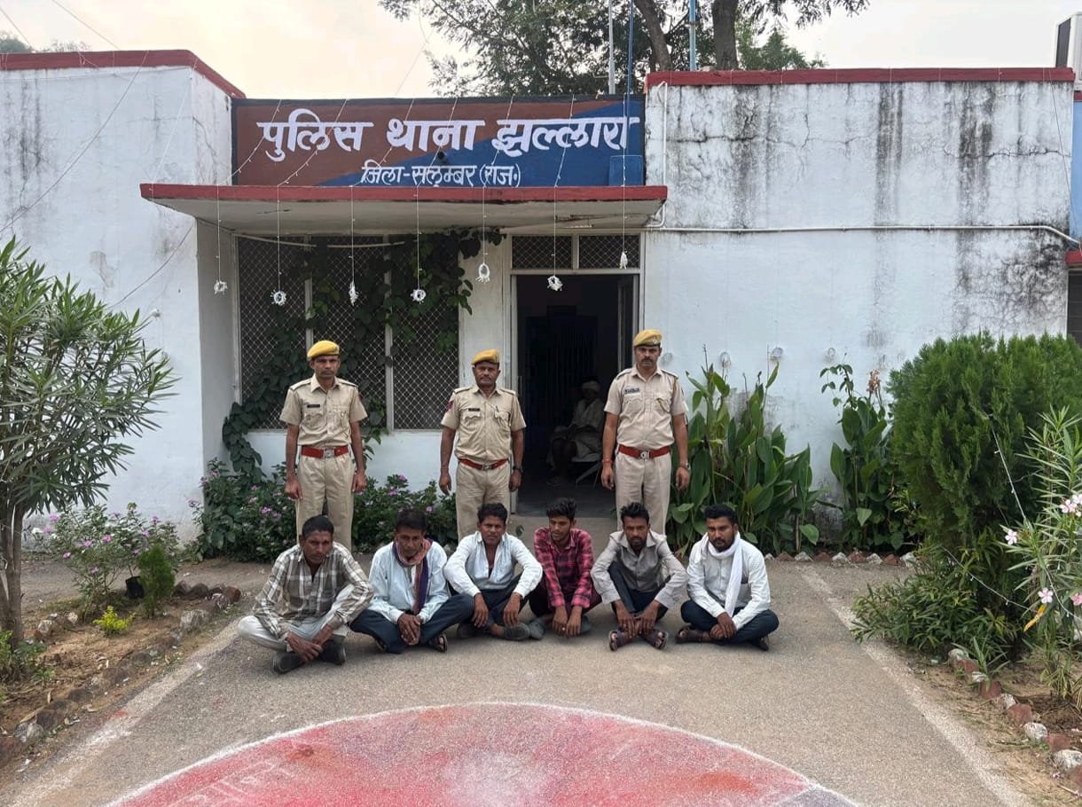 वाघेला थाना झल्लारा के निर्देशन मे टीम द्वारा थाना हाजा के प्रकरण में दिपावली त्यौहार के दिन मारपीट कर दहशत फैलाने वाले 6 अभियुक्त 1. शंकर पिता देवा मीणा उम्र 31 वर्ष 2. शंकर पिता हवजी मीणा उम्र 55 वर्ष 3. अरविन्द पिता कालु मीणा उम्र 21 वर्ष 4. वक्ता पिता दौला मीणा उम्र 43 वर्ष 5. गंगाराम पिता दौला उम्र 55 वर्ष निवासीयान ओड थाना झल्लारा जिला सलुम्बर व मांगीलाल पिता मावाजी मीणा उम्र 32 वर्ष निवासी केनर थाना झल्लारा जिला सलुम्बर को गिरफतार कर कार्यपालक मजिस्टेत सलुम्बर के समक्ष पेश किया गया। पुलिस टीम धर्मेन्द्र सिंह वाघेला थानाधिकारी, सुरेन्द्र कुमार हैडकानि, महेन्द्र सिंह कानि, प्रकाश कानि, पुष्पेन्द्र सिंह कानि के सफल प्रयास से अनुसन्धान किय