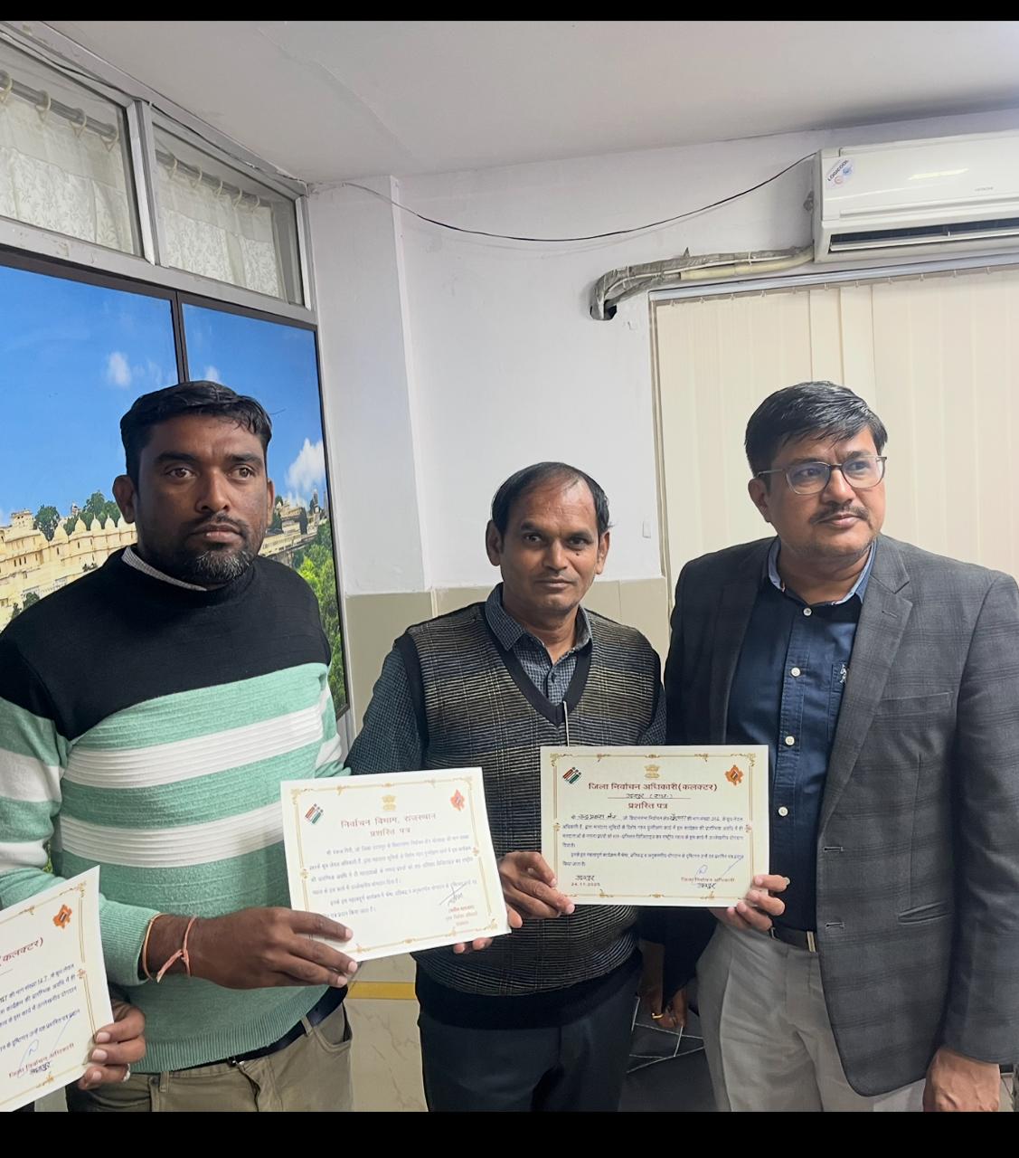 ( कलेक्टर) द्वारा उदयपुर में श्री पंकेश गिरी गोस्वामी भाग संख्या 281 वली एवम श्री चंद्र प्रकाश जैन भाग संख्या 302 जोधपुरिया द्वारा खेरवाड़ा विधानसभा में अव्वल कार्य करने हेतु सम्मानित किया गया। उक्त दोनों बीएलओ द्वारा मतदाताओं से विशेष संपर्क कर महिला मतदाताओं के पीहर पक्ष से संपर्क कर मैपिंग का कार्य शीघ्र पूर्ण किया ।साथ ही वली एवम जोधपुरियां के मतदाताओं एवम युवाओं का भी विशेष सहयोग रहा।