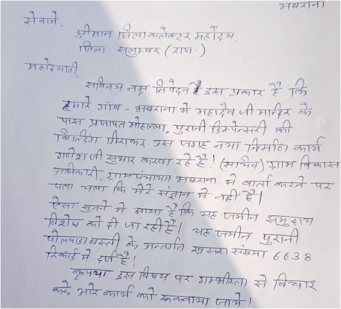 ग्राम पंचायत भबराना में महादेव जी मंदिर के पास स्थित प्रजापत मोहल्ला क्षेत्र में ग्राम पंचायत की भूमि पर किए जा रहे नए निर्माण को लेकर ग्रामीणों ने कड़ा विरोध जताया है। इसी को लेकर ग्रामीणों के प्रतिनिधिमंडल ने जिला कलेक्टर सलूम्बर को ज्ञापन सौंपकर मामले में तत्काल हस्तक्षेप की मांग की है।