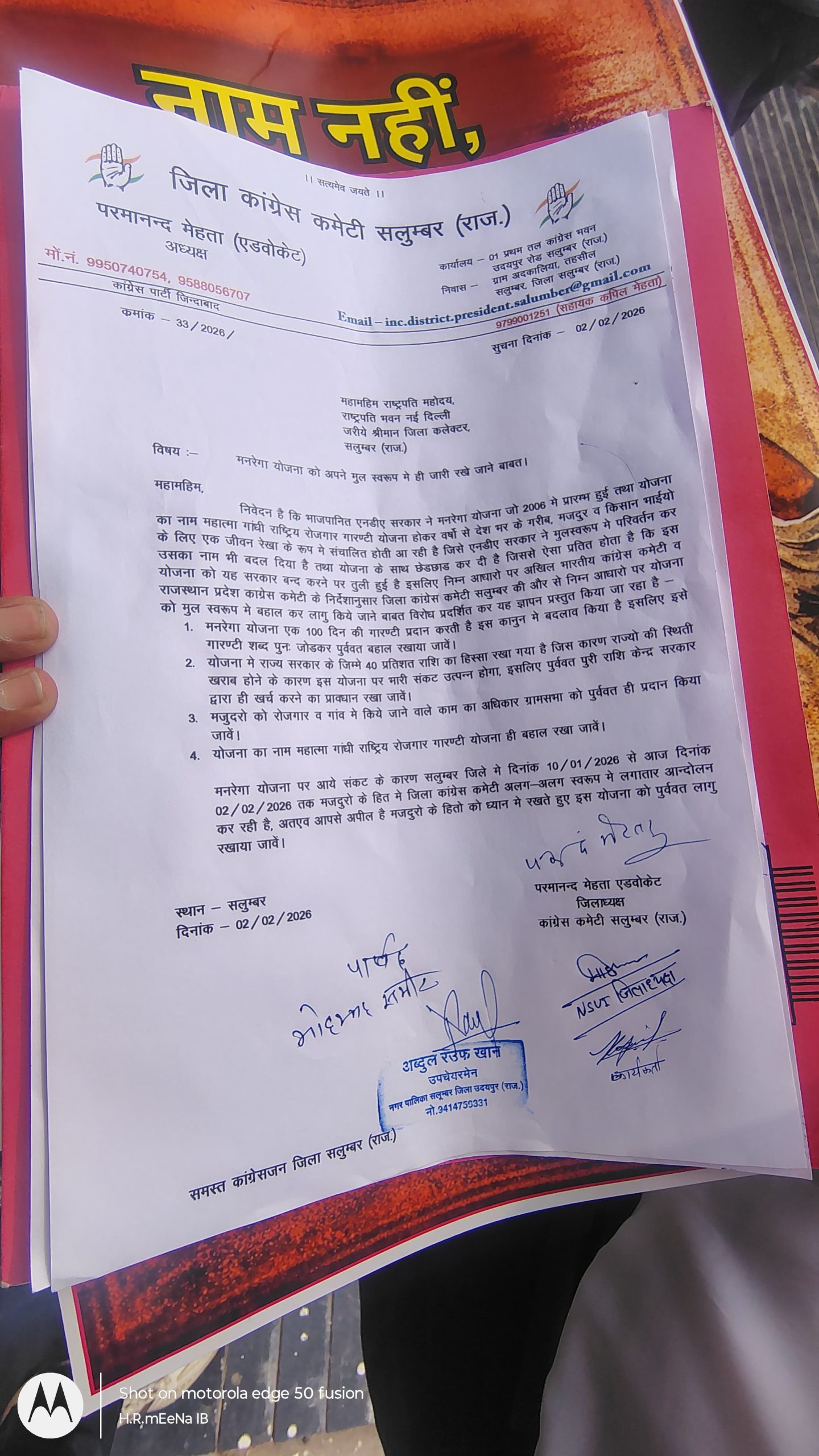 सलूम्बर महात्मा गांधी राष्ट्रीय रोजगार गारंटी योजना (मनरेगा) के मूल स्वरूप से छेड़छाड़ किए जाने के विरोध में जिला कांग्रेस कमेटी सलूम्बर की ओर से महामहिम राष्ट्रपति महोदय के नाम जिला कलेक्टर के माध्यम से ज्ञापन सौंपा गया। ज्ञापन में केंद्र की भाजपा-नीत एनडीए सरकार पर मनरेगा को कमजोर करने और धीरे-धीरे समाप्त करने की मंशा का आरोप लगाया गया।