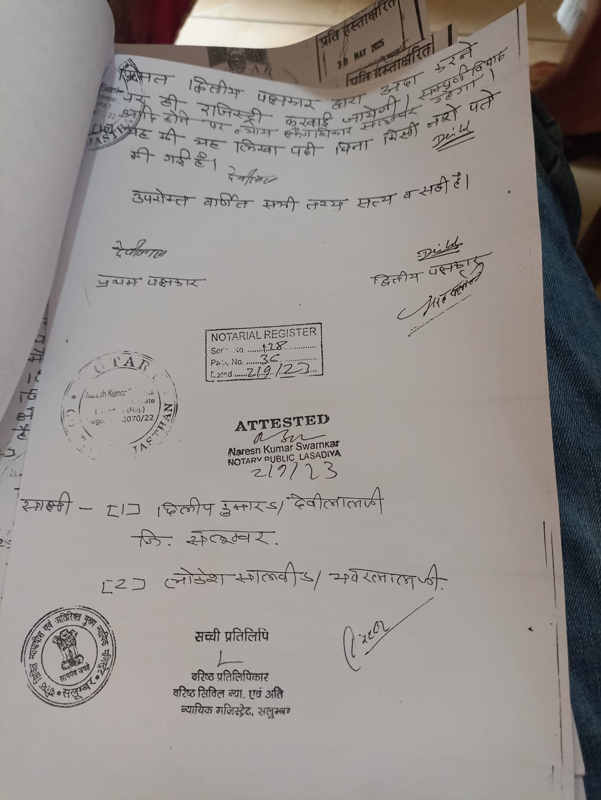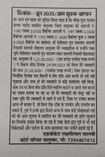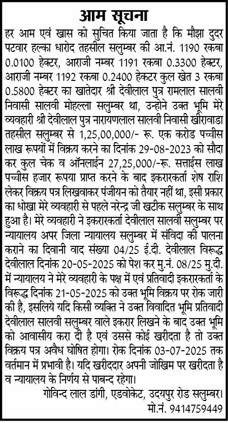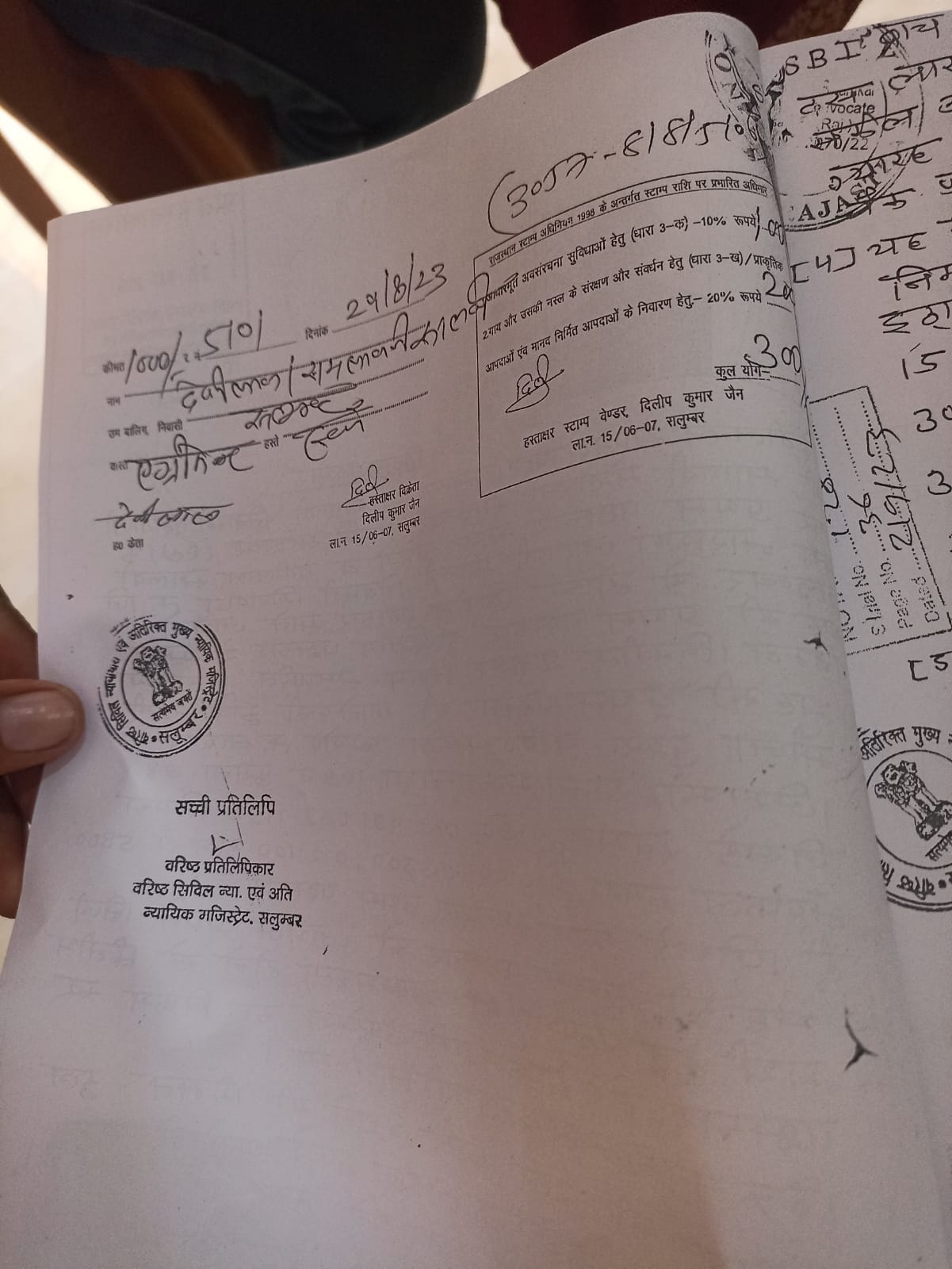 पीड़ित पक्ष द्वारा 20 मई 2025 को अतिरिक्त जिला न्यायालय, सलूम्बर में संविदा पालन का दिवानी वाद दायर किया गया, जिसका मुकदमा संख्या 04/25 है। न्यायालय ने 23 मई 2025 को उक्त भूमि के हस्तांतरण और निर्माण पर अस्थायी निषेधाज्ञा (स्टे) जारी की, जो वर्तमान में भी प्रभावी बताई जा रही है।