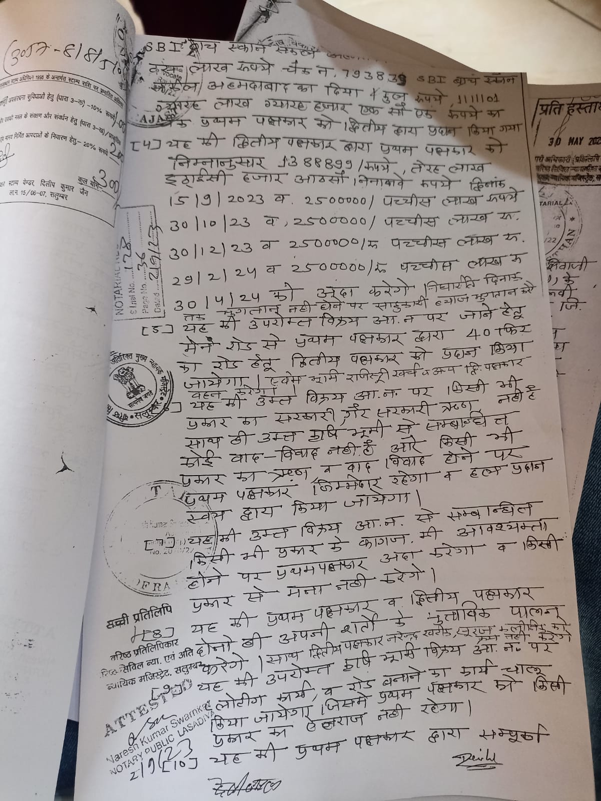 प्राप्त जानकारी के अनुसार उक्त भूमि का 29 अगस्त 2023 को 1 करोड़ 25 लाख रुपये में विक्रय इकरार किया गया। सौदे के तहत 27 लाख 25 हजार रुपये चेक व ऑनलाइन माध्यम से प्राप्त किए जाने की बात सामने आई है। आरोप है कि शेष राशि लेने के बावजूद विक्रय पत्र (रजिस्ट्री) नहीं किया गया।