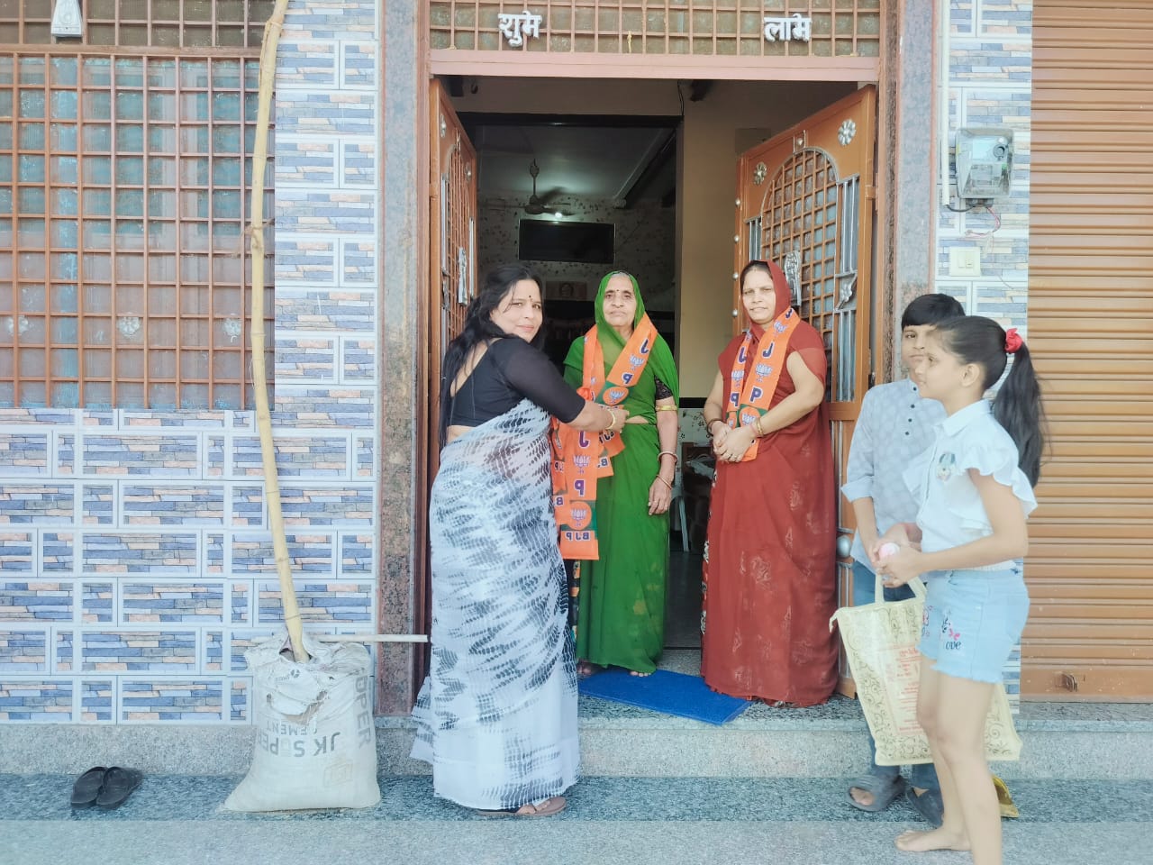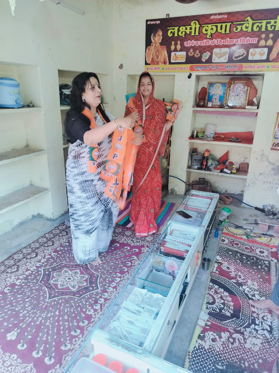 उपचुनाव को लेकर सलूंबर विधानसभा के सलूंबर क्षेत्र में बी जे पी प्रत्याशी अमृत लाल पत्नी शांता मीणा के जनसंपर्क कार्यक्र में बी जे पी नेता ने जनसंपर्क के
