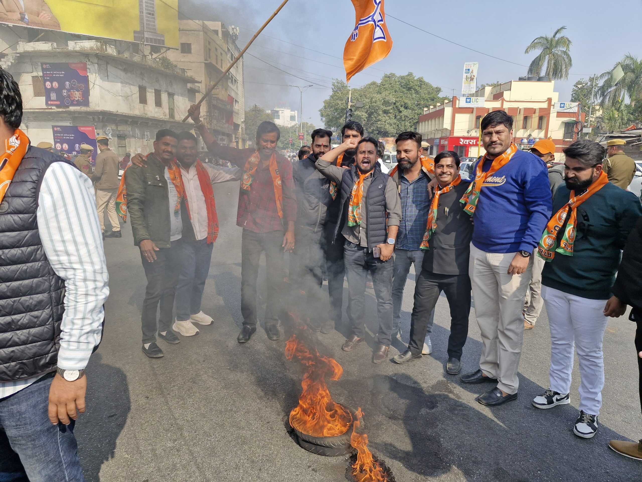 कांग्रेस द्वारा गृहमंत्री अमितभाई शाह के बयान को तोड़मरोड़कर पेशकर वर्गविशेष को भड़काकर डॉ. बाबासाहेब अंबेडकर के प्रति अनादर और राहुल गांधी के संसद में भाजपा के सांसदों के साथ निंदनीय व्यवहार किया गया जिससे कुछ भाजपा सांसद घायल हुए इसके खिलाफ आज भाजयुमो द्वारा उदयपुर देहात ने आज देहलीगेट पर टायर जलाकर विरोध प्रदर्शन किया।