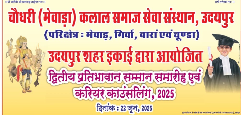 उदयपुर। चौधरी मेवाड़ा कलाल समाज सेवा संस्थान उदयपुर शहर इकाई द्वारा आयोजित द्वितीय प्रतिभावान समारोह एवं करियर काउंसलिंग का कार्यक्रम रखा गया है रविवार को प्रातः 9:00 बजे चित्रकूट नगर स्थित